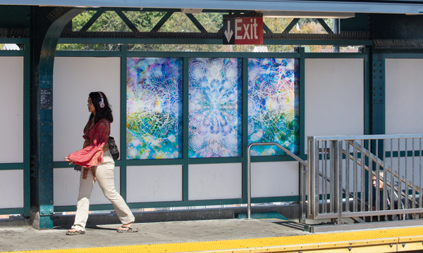 Angie Drakopoulos’ “Liminal” revels in the ways in which travel, particularly the daily subway commute, can serve as a powerful tool for contemplation and transformation. The title is inspired by the Latin word “limen,” meaning a space between one state and another, which reflects the unique position of the station as a threshold between Brooklyn and Queens. For the artist, riders also exist in this same state of transition as they move to and from various destinations, part of the larger cycle of the human experience in a bustling city. Drakopoulos creates a bridge between inner and outer worlds, bringing the earthly landscape of the surrounding Woodhaven neighborhood into the same realm as complex celestial bodies and microorganisms outside of normal view. Fabricated by Depp Glass, the 24-panel printed, laminated glass artwork is installed in the elevated station’s platform windscreens.